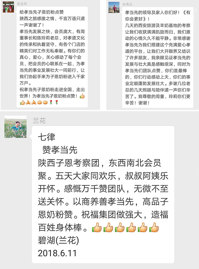 活動結(jié)束后,考察團(tuán)各協(xié)會領(lǐng)導(dǎo)第一時間給孝當(dāng)先發(fā)來了感謝信和祝福語,紛紛為子恩羊奶點贊,為孝當(dāng)先點贊。