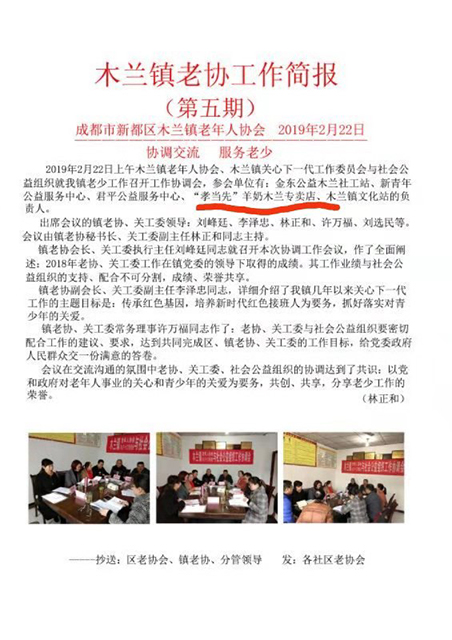 2019年2月22日上午,四川新都木蘭鎮(zhèn)老年人協(xié)會(huì)、關(guān)心下一代工作委員會(huì)與社會(huì)公益組織工作協(xié)調(diào)會(huì)順利召開(kāi)。會(huì)議由鎮(zhèn)老協(xié)秘書(shū)長(zhǎng)、關(guān)工委副主任林正和主持,孝當(dāng)先新都木蘭羊奶專賣店受邀出席。