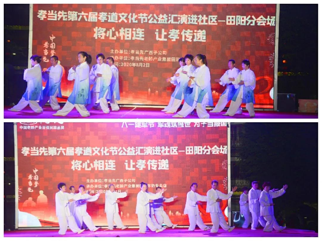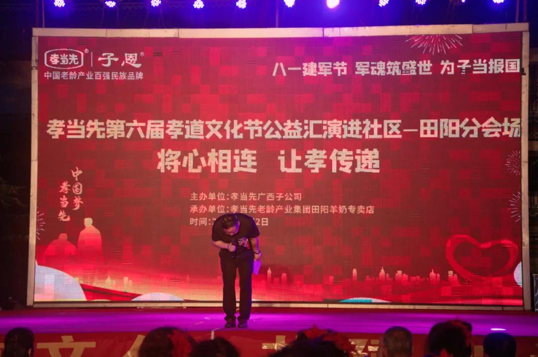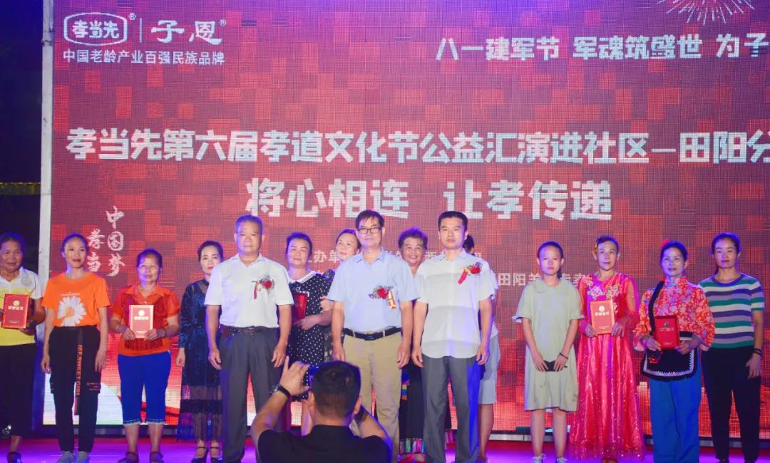 以“感動田陽孝心人物征選”為主題的廣西區(qū)域萬人孝道文化節(jié)暨八一建軍節(jié)大型公益匯演活動,邀請到廣西田陽區(qū)老體協(xié)主席黃朝康先生,老體協(xié)副主席徐愛麗女士,老體協(xié)秘書長黃煥昌先生,田陽區(qū)各社區(qū)領(lǐng)導(dǎo)和敢壯山歌傳承基地傳承人向少賢先生等嘉賓的蒞臨出席,并在田陽區(qū)老體協(xié)副主席徐愛麗女士代表嘉賓領(lǐng)導(dǎo)講話,和孝當先廣西子公司李宏祥總經(jīng)理對活動進行致辭下正式揭幕。同時,亦為接下來在全國其他區(qū)域,即將同步盛大啟幕的“孝當先第六屆萬人孝道文化節(jié)”,作了完美的承上啟下周致鋪墊。