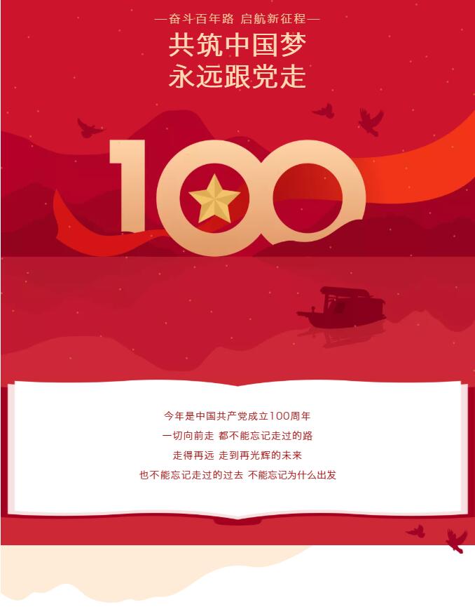100年的風(fēng)雨歷程,100年的輝煌歷史,100年的開拓進(jìn)取。偉大的中國(guó)共產(chǎn)黨高舉指路的明燈,為我們指引前進(jìn)的方向。永遠(yuǎn)跟黨走,實(shí)現(xiàn)我們的抱負(fù)和遠(yuǎn)大的理想。永遠(yuǎn)跟黨走,擔(dān)當(dāng)未來(lái)的責(zé)任成為民族的脊梁。