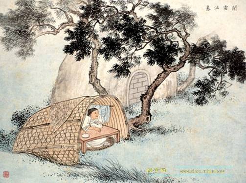 王裒,魏晉時期營陵(今山東昌樂東南)人,博學(xué)多能。父親王儀被司馬昭殺害,他隱居以教書為業(yè),終身不面向西坐,表示永不作晉臣。其母在世時怕雷,死后埋葬在山林中。每當(dāng)風(fēng)雨天氣,聽到雷聲,他就跑到母親墳前,跪拜安慰母親說:“裒兒在這里,母親不要害怕?!彼虝鴷r,每當(dāng)讀到《蓼莪》篇,就常常淚流滿面,思念父母。