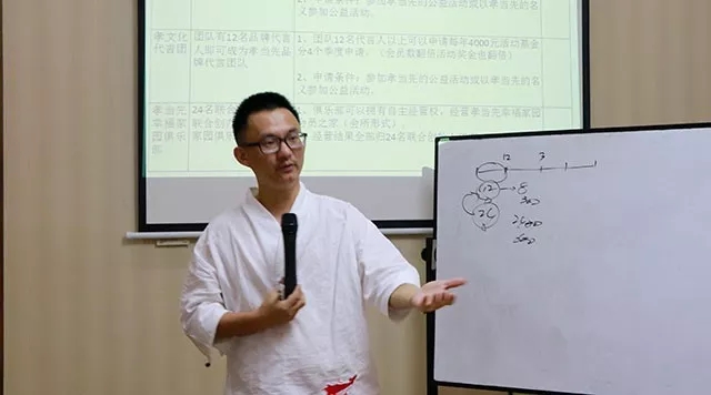 ▲集團(tuán)董事長周國兵在會上深度剖析“孝當(dāng)先集團(tuán)4.0眾創(chuàng)運(yùn)營方案 ”