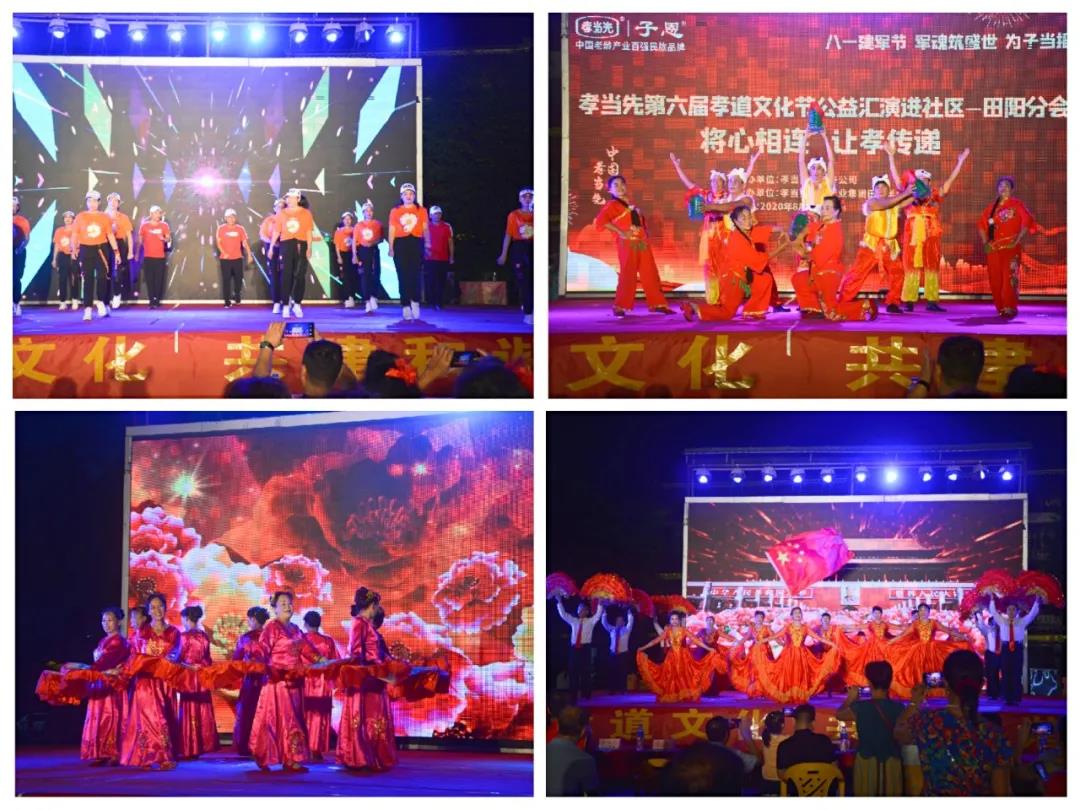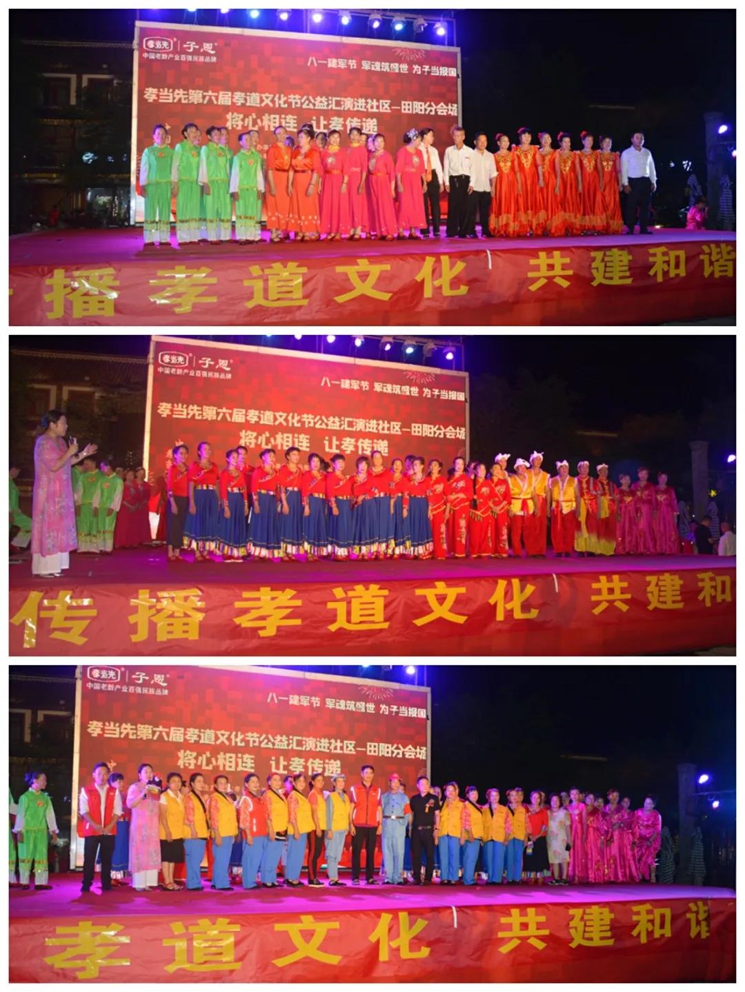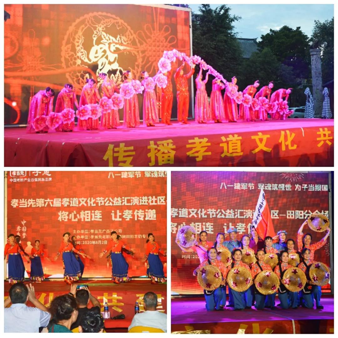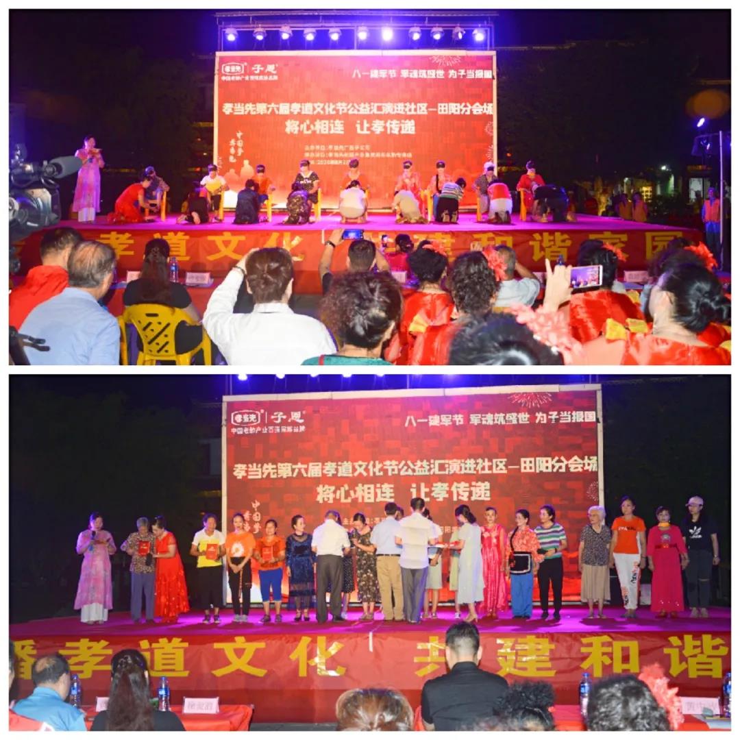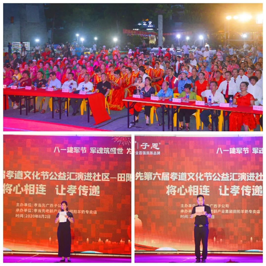 以“感動田陽孝心人物征選”為主題的廣西區(qū)域萬人孝道文化節(jié)暨八一建軍節(jié)大型公益匯演活動,邀請到廣西田陽區(qū)老體協(xié)主席黃朝康先生,老體協(xié)副主席徐愛麗女士,老體協(xié)秘書長黃煥昌先生,田陽區(qū)各社區(qū)領(lǐng)導(dǎo)和敢壯山歌傳承基地傳承人向少賢先生等嘉賓的蒞臨出席,并在田陽區(qū)老體協(xié)副主席徐愛麗女士代表嘉賓領(lǐng)導(dǎo)講話,和孝當先廣西子公司李宏祥總經(jīng)理對活動進行致辭下正式揭幕。同時,亦為接下來在全國其他區(qū)域,即將同步盛大啟幕的“孝當先第六屆萬人孝道文化節(jié)”,作了完美的承上啟下周致鋪墊。