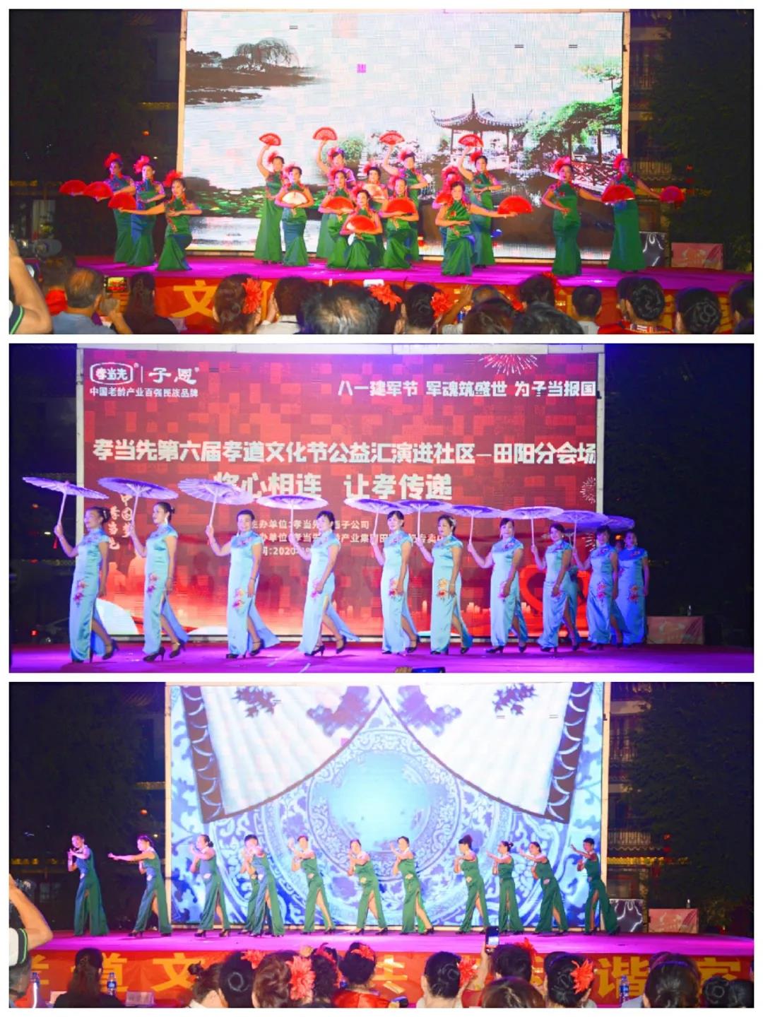 匯演活動現(xiàn)場共有16支文藝團隊傾情演出,除上述節(jié)目外,還有豐富多彩并絕艷登場的舞蹈表演同樣引人入勝:群藝隊的《中國大舞臺》,貝儂藝術(shù)團的《心上的羅加》,壯鄉(xiāng)藝術(shù)團的《共圓中國夢》,知青藝術(shù)團的《走進新時代》,傳承彩調(diào)團的《祝福祖國》,九九健身藝術(shù)團的《一壺老酒》,頭塘美丹隊的《紅海紅,中國紅》,夢幻踏韻隊的《串燒兄弟情》…琳瑯滿目的歌舞表演,神形兼?zhèn)涞奈枳?,動人心弦的歌喉,座無虛席的現(xiàn)場觀眾及嘉賓領(lǐng)導(dǎo)們,除對以傳承及弘揚孝道文化底蘊為宗旨的盛典交口稱贊外,無一不均為之精彩紛呈的節(jié)目鼓掌歡呼!